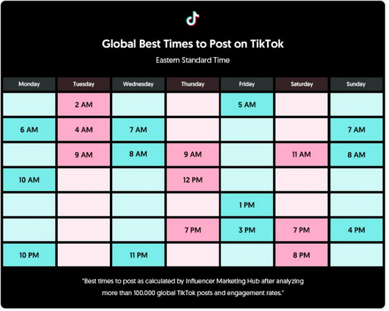 在最佳時間發布您的標簽內容,以確保最大程度的可見性。在評估了來自世界各地的 100,000 條帖子的表現后,我們編制了下面的圖表,以幫助您找出TikTok 的最佳發布時